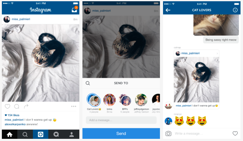 Nově lze do Directu sdílet fotografie a videa přímo ze zdi pomocí tlačítka pro sdílení, které se objeví vedle ikony pro srdíčka a komentáře. Objeví se rychlý náhled kontaktů nebo vytvořených skupin, které stačí zvolit a fotografie se automaticky odešle. Přímo v chatu je pak možné vyfotit fotografii a odeslat ji nebo odpovídat emotikonami, které jsou nyní velké podobně jako na Messengeru od Facebooku. Celkově se Instagram nyní podobá lehce Messengeru, jelikož od něho přejímá některé prvky.