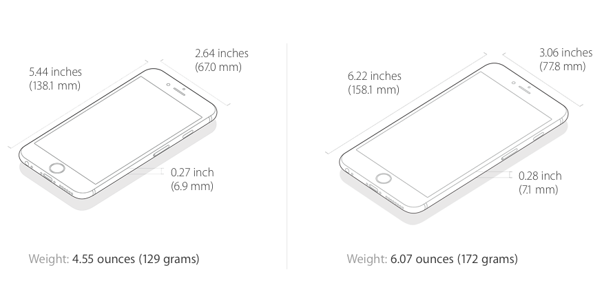 Kromě tloušťky se změnily i další rozměry, tedy výška a šířka telefonu. iPhone 6s má na výšku přesně 138,3 mm a na šířku 67,1 mm, zatímco iPhone 6 má na výšku 138,1 mm a na šířku 67,0 mm. Stejně tak se změnila i hmotnost telefonu. iPhone 6 váží 129 gramů, zatímco nejnovější iPhone 6s 143 gramů. Podobně se zvětšil a ztěžkl i větší iPhone 6s Plus. Přesné rozměry můžete vidět na obrázcích níže.