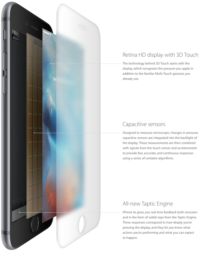 Technologie samotná funguje na poměrně zajímavém principu. Apple ukryl do podsvícení displeje kapacitní senzory, které měří změny tlaku mezi krycím sklem a podsvíceným, což v kombinaci s dotykovým displejem a akcelometrem dokáže určit přesný tlak, jakým na displej tlačíte. iPhone dokáže reagovat na změnu tlaku do 10 milisekund, což je hodnota, která se jeví pro lidské vnímání jako okamžitá reakce v případě detekce největší síly je pak odezva do 15ms.