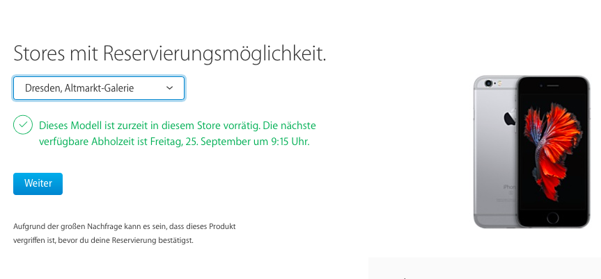 Eagles23: rezervace v Drazdanech byly pryc cca kolem 10:30 na vetsinu vetsich kapacit, ja u toho sedel od 9:00 a puvodne tam byl rezervacni system jako na Watch, takze pozadoval telefonni cislo (podle me chteli zvyhodnit lokalni zajemce a po pul hodine uz to slo bez cisla, stejne tak se snazi cizince odlakat tim nemeckym dokladem, loni to bylo stejne) nakonec nam vyslo 10x asi nejzadanejsi 6s 64GB do Mnichova, takze je potreba rezervaci udelat co nejdrive. Loni bylo v Mnichove na prvni den cca 5.000 kusu. Pokud ho hodne chcete prvni den, tak zkuste jiniu barvu, pokud nepotrebujete hned, tak nejake rezervace pujdou od 26.9. dale, ale je potreba pocitat s tim, ze rezervace je pouze na 30min a pocet kusu je omezeny – z moji zkusenosti z poslednich let jsou cca tyden po prodeji prodejny zasobovany a neni problem vyzvednout vicemene kdykoli – horsi je to v dobe kdy se dostavaji na nas trh a dale, to maji problem uspokojovat zakazniky i v Nemecku.