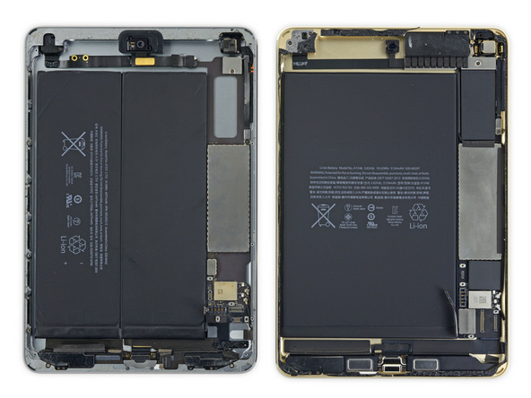 Co se týče baterie, tak iPad mini 4 nabízí bohužel o něco menší baterii než loňský iPad mini 3 respektive předloňský iPad mini 2. Navíc se baterie skládá jen z jednoho jediného článku namísto dvou, jak tomu bylo u minulé generace. Anténa pro Wi-Fi případně pro mobilní síť také prošla změnou, jelikož nyní je rozdělena a jedna část se nachází na horní straně těla tabletu jako u iPadu Air a druhá v dolní část jako u předchozího iPadu mini. iFixit také potvrdil 8 Mpx zadní kameru a 1,2 Mpx FaceTime kameru. Uvnitř tiká procesor Apple A8, kterému sekundují 2GB operační paměti RAM.