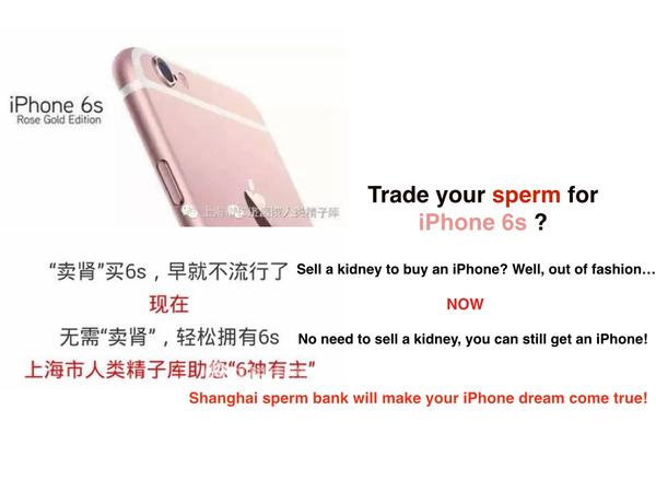 „Nemusíte se vzdávat svojí ledviny, abyste si mohli koupit nový iPhone 6S. Jak můžete peníze získat? Stačí jen darovat sperma,“ lákají slogany spermabank dárce, kteří chtějí finance na nový jablečný telefon. Čína se totiž potýká extrémním množstvím homosexuálů, kterých je v této zemi mnohem víc než kdekoli jinde na světě a i když jsou ve světě známé především kvóty, které zamezují lidem mít víc dětí než jedno ve městě a dvě na vesnici, realita je taková, že tato východní země pomalu vymírá. V provincii Chu-pej si tak můžete darováním sperma vydělat až několik tisíc za jednu dávku. Pokud se tedy chystáte do Číny, existuje způsob jak si můžete na nový telefon vydělat a ještě si u toho něco užít.