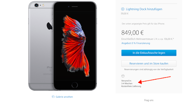Jak můžete vidět níže, základní iPhone 6s Plus v 16GB a Space Gray variantě dorazí dokonce až do 3–4 týdnů. U menšího iPhonu 6s je situace i něco lepší, ale i tak dorazí do 1–2 týdnů. Pokud tedy nemáte předobjednáno a přesto chcete iPhone 6s co nejdříve, doporučuji navštívit v pátek Apple Store, kde by pro vás iPhone měli mít, ale budete si muset vystátá frontu.