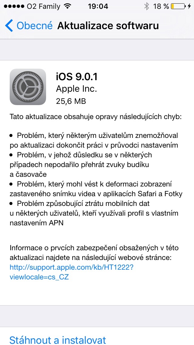 Tak trochu nečekaně Apple právě vydal iOS 9.0.1. Nejnovější update má samozřejmě řešit několik chyb, na které si stěžovali uživatelé po updatu na iOS 9. Update především řeší problém, který znemožňoval pokračovat v nastavení při updatu na iOS 9, kdy se objevila jen bílá obrazovka a celý telefon zamrzl. Jak ale můžete vidět níže, tak iOS 9.0.1 řeší jen některé konkrétní chyby, ale celkově nezlepšuje stabilitu systému, na kterou si tak polovina uživatelů stěžuje.