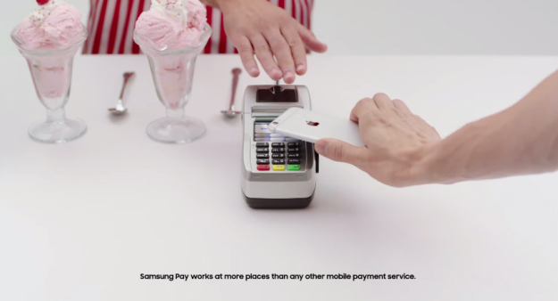 Jak už jsem zmínil, v minulé reklamě Samsung zesměšňoval absenci bezdrátového nabíjení, tentokrát si vzal na mušku Apple Pay respektive vychloubal se se svým Samsung Pay. Vtipné na tom ale je, že Samsung přišel se svou platební metodou pomocí telefonu až několik měsíců poté, co Apple představil Apple Pay. Samsung se v nejnovější reklamě snaží ukázat, že služba Samsung Pay je snadno rozšiřitelná, jelikož bude fungovat s dosavadními platebními terminály, zatímco pro Apple Pay je potřeba speciální terminál.