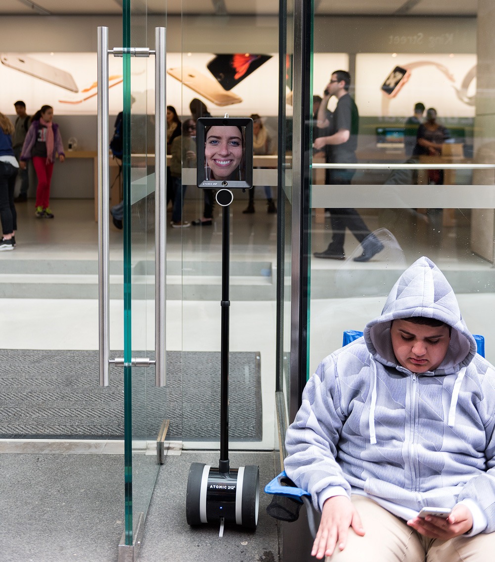 Jedna žena ze Sydney ale spojila trochu od obojího, jelikož před australský Apple Store postavila robota, který se skládá z iPadu a Segway. Na obrazovce iPadu je pak její tvář, jelikož volá přes FaceTime, tudíž si s ní může kdokoli popovídat, a to i protože pod iPadem se nachází větší reproduktor, který zajistí kvalitnější komunikaci.