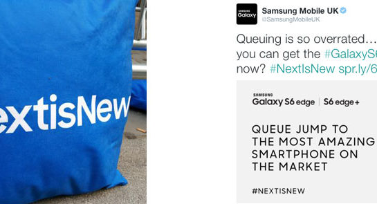 Samsung, respektíve marketingová agentúra, ktorá má akciu na starosti, začala ľuďom stojacim v rade rozdávať vankúše, deky a fľaše s vodou, na ktorých sa nachádzal slogan Samsungu, #NextisNew. Ako si následne začali niektorí ľudia v rade zisťovať, hashtag používa britský Samsung na propagovanie svojho nového Galaxy S6 edge+. K tomu priradila slogan „Státie v rade je tak precenené. Prečo stáť v rade, keď Galaxy S6 edge+ môžete získať hneď teraz?“ a dodal, že ide o najúžasnejší mobil na trhu.