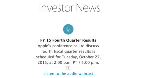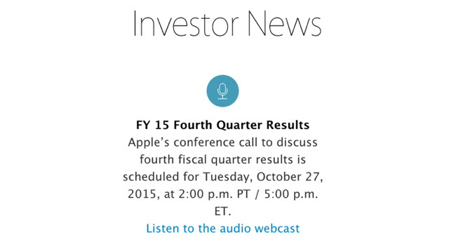 Spoločnosť Apple práve oznámila, že už o mesiac, 27. októbra/října 2015 o 21:30, oznámi finančné výsledky za posledný kvartál fiškálneho roku 2015 a zároveň ho uzavrie. Počnúc budúcim mesiacom, spoločnosť zaháji fiškálny rok 2016, ktorý by sa mal vyvinúť pre Apple zrejme úspešne, obzvlášť keď iPhone 6s zaznamenal rekordné predaje behom prvého víkendu dostupnosti v prvej vlne krajín. Očakáva sa samozrejme, že iPhone 6s bude mať úspech aj počas nasledujúcich týždňov a poriadne „nakopne“ štatistiky behom nasledujúcich mesiacov.