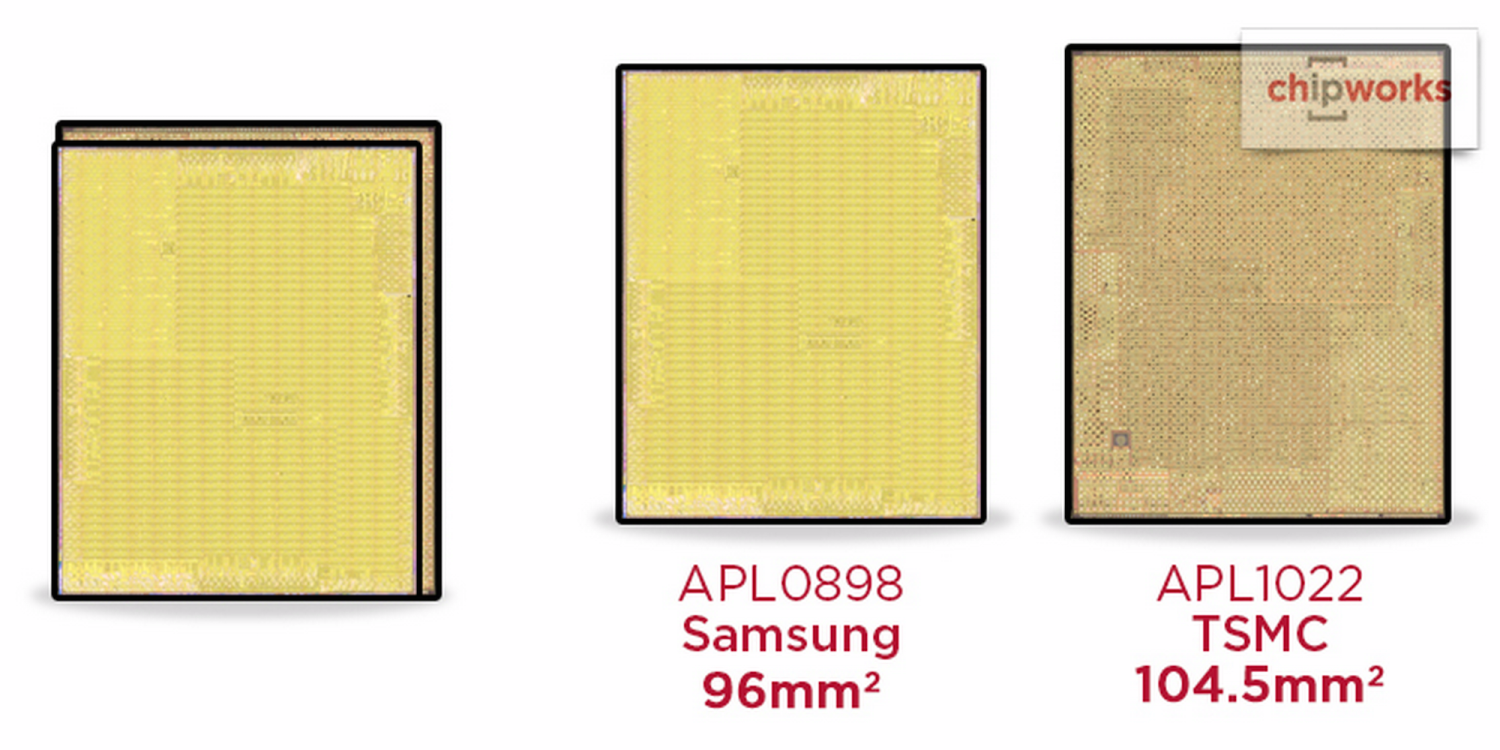 Poněkud zvláštnější je ale zjištění, že i když se ve finále jedná vždy o stejný procesor, tak od každé ze zmíněných společností je jinak velký. Procesor A9 od společnosti Samsung nesoucí produktové označení APL0898 zabírá plochu o velikosti 96mm čtverečních, zatímco verze s označením AAPL1022 od společnosti TSMC se chlubí plochou 104.5 mm čtverečních, tudíž je o 10% větší, než jeho bratříček od Samsungu, který by měl být úplně stejný. To by mohlo znamenat, že verze od Samsungu je možná o něco energeticky účinnější, než verze od TSMC a navíc bude pravděpodobně vyráběna 14nm technologií a verze od TSMC 16nm technologií, o čemž se spekulovalo už na začátku tohoto roku.