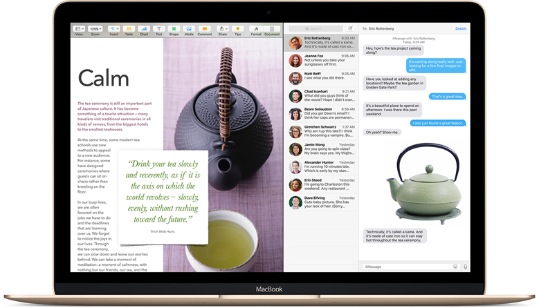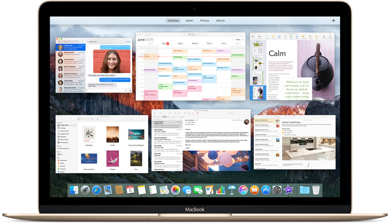 Další a asi vůbec největší novinkou je Slit View, který můžete znát také z iOS 9 respektive z iPadu Air 2. Jde v podstatě o stejnou funkci, tedy že si rozdělíte dvě aplikace na jednu obrazovku přesně vedle sebe. Slit View funguje tak , že se automaticky zaplní obrazovka dvěma aplikacemi, které vyberete. Takže můžete třeba ve Zprávách domlouvat večeři s kamarády, zatímco v Mapách hledáte restauraci. Nebo pracovat na dokumentu v Pages a přitom si dohledávat souvislosti v Safari. Bez rozptylování jinými otevřenými aplikacemi a bez toho, abyste museli okna ručně zmenšovat, zvětšovat nebo přetahovat sem a tam. Tato funkce je podporována jen v režimu aplikací na celou obrazovku, tudíž se otevře i jako samostatné okno vedle plochy, mezi kterými můžete přepínat buďto pomocí trackpadu nebo přímo v Mission Control.