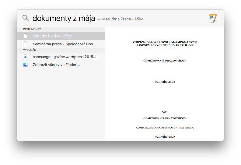 Už niekoľko rokov sme sa všetci sťažovali, že OS X neobsahuje Siri a nemôžeme ovládať niektoré funkcie systému pomocou ľudskej reči. No aj keď to vyzerá, že Siri sa na Macu tak skoro neobjaví (ak vôbec), so svojim Macom už môžete komunikovať ľudsky. V skutočnosti totiž stačí aktivovať Spotlight (pomocou klávesovej skratky CMD+Medzerník) a už len zadajte, čo potrebujete vedieť alebo nájsť. Napríklad „Dokumenty z mája/května“. Kupodivu to funguje aj v slovenčine a Spotlight vám pohotovo nájde všetky dokumenty, ktoré boli vytvorené v máji / květnu. Súbory hľadá podľa času ich vytvorenia, preto ak ste mali už dávnejšie stiahnutú šablónu, napríklad šablónu motivačného listu do zamestnania, tak ho nájdete napríklad zadaním roku, kedy bol vytvorený (Dokumenty z 2005).