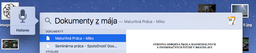 Ako som vravel vyššie, Siri na Macu neexistuje. Zatiaľ. Ale môžete sa tváriť, že ju máte, pretože Spotlight viete ovládať aj diktovaním textu. Po otvorení Spotlightu stlačte dvakrát tlačidlo Fn, čím zapnete diktovanie. Teraz už len stačí povedať, čo chcete hľadať a môžete to povedať aj ako človek. Napríklad vyššie spomínané Dokumenty z marca.