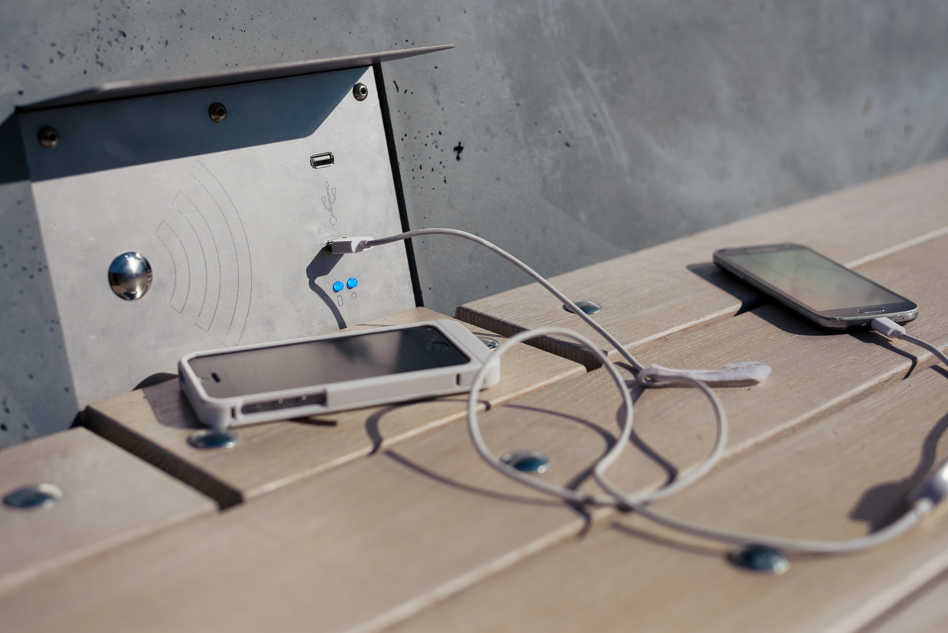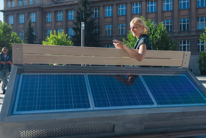Část lavičky je vyrobena také z oceli a kovu, povrch je tvořen dřevem, a nejmodernějším solárním panelem o výkonu 150 W. V lavičce je zabudovaná baterie s kapacitou 110 Ah. Díky ní lavička funguje, i když zrovna není na přímém slunečním svitu. Z baterie je možné nabíjet mobilní zařízení přes dva USB konektory nebo bezdrátově pomocí indukce. Součástí lavičky je i zařízení monitorující čistotu ovzduší, takzvaný „kanárek“, a vestavěný GSM LTE modem, který přijímá a dál přes wi-fi router zdarma šíří signál rychlého mobilního internetu.
