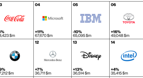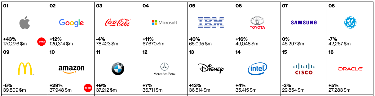 Apple sa dostal na prvé miesto v roku 2013, kedy prekonal Coca-Colu. Tá sa predtým udržiavala na prvom mieste so „sladkou vodou“, ako by ju nazval Steve Jobs (vieme, nazval tak Pepsi, keď preverboval Johna Sculleyho z Pepsi do Applu ako CEO). Teraz sa však nachádza na treťom mieste, medziročne jej kapitál klesol o 4%, na 78,4 miliardy dolárov. Do zoznamu Top 10 sa taktiež dostala aj Toyota, General Electronics, McDonald’s a Amazon.
