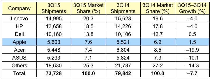 Vo svete počítačov sa dejú zaujímavé veci a zatiaľ čo predaje ostatných počítačov pravidelne klesajú, Apple rastie. Ukazuje sa totiž, že v uplynulom kvartáli si prilepšil len Apple a Dell, zatiaľ čo ostatní velikáni ako je Lenovo, HP, Acer a ASUS, klesli. Celkovo však trh zaznamenal pokles o 7,7% oproti minulému roku. Dokopy sa na trhu predalo 73,7 miliónov počítačov, zatiaľ čo pred rokom to bolo 79,8 miliónov. Mac sa zaradil na štvrté miesto so 7,6% podielom a 5,6 miliónmi predaných počítačov, zatiaľ čo pred rokom mal 6,9% podiel a 5,5 miliónov kusov. Medziročne si prilepšil o 1,5%. Dell si prilepšil o niečo menej, o 0,5%, napriek tomu sa ale zaradil na tretie miesto s 10,2 miliónmi predaných počítačov (13,8%) oproti minuloročným 10,1 miliónom (12,7%).