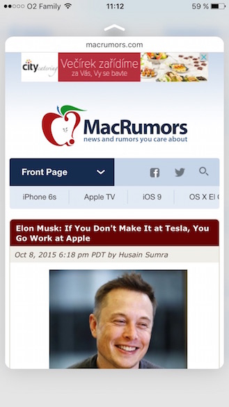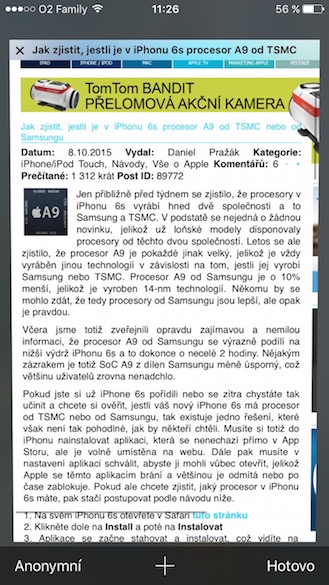 V Safari můžete nyní zobrazovat jakési náhledy na otevřené panely. Stačí mít telefon na výšku a vpravo dole kliknout na na dvě překrývající se okénka, díky čemu vyvoláte přepínač mezi otevřenými panely, což už asi všichni znáte. Pomocí 3D Touch displeje si ale po slabém stlačení některého z otevřených panelů zobrazíte jeho náhled a následným domáčknutím jej můžete aktivovat, tudíž se otevře na celou obrazovku.