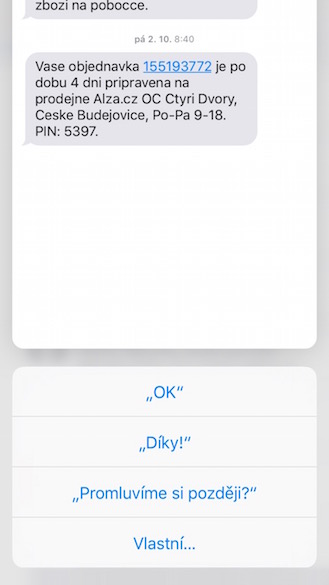 Stejně tak pokud ve Zprávách zatlačíte na kteroukoli zprávu a pojedete prstem nahoru, tak se dole zobrazí rychlé odpovědi, které můžete okamžitě odeslat.