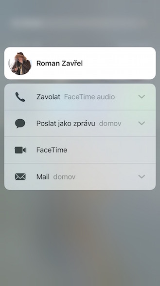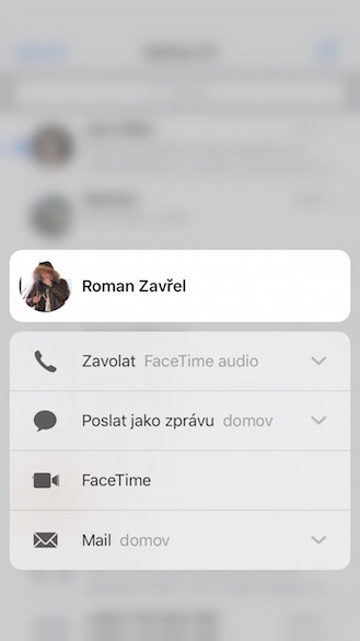 V aplikaci Zprávy, Mail, Kontakty nebo klidně i přímo v postranním Spotlightu můžete silněji stlačit jakýkoli kontakt nebo jeho fotografii a okamžitě se zobrazí možnost zahájení běžného hovoru nebo přes přes FaceTime či odeslání zprávy a emailu. Musíte ale kliknout přímo na fotografii a v postranním Spotlightu musíte na kontakt silněji zatlačit a pak dát prst z obrazovky pryč, aby se nabídka zobrazila.