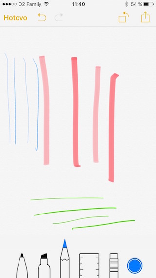 V aplikaci poznámky můžete nově na iOS 9 kreslit tužkou nebo fixou apod. Díky 3D Touch ale můžete kreslit i různě tlusté nebo výrazné čáry. Stačí buďto po displeji jen jezdit, přičemž bude fixa psát slabě, ale pokud na displej zatlačíte a táhnete, tak se bude kreslit výraznější čára. Stejně tak můžete i rychleji gumovat případné chyby.