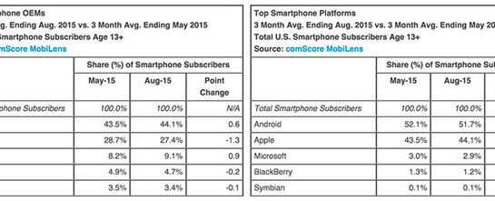 Najnovšia štatistika spoločnosti comScore ukázala, že iPhone získal 44,1% podiel na americkom trhu, zatiaľ čo konkurenčný Samsung znížil svoj podiel len na 27,4%. Naopak v májovom/květnovom kvartáli mal iPhone podiel 43,5% a Samsung 28,7%, vďaka čomu je vidieť pokračujúci pokles popularity telefónov Galaxy na tamojšom trhu. Na druhú stranu je však Samsung stále dominantným výrobcom mobilov s Androidom a spolu s výrobcami ako je LG, Motorola, HTC a ďalší, prekonali Apple aspoň po stránke rozšírenia operačného systému. Android vďaka nim získal podiel 51,7%. iOS síce prekonali, ale podiel im klesol o 0,4% oproti predošlému kvartálu. Celkovo bolo v krajine predaných 191,1 miliónov mobilov.