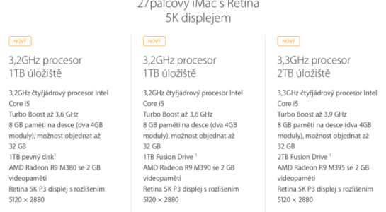 Spoločnosť Apple dnes okrem úplne nového 21.5″ iMacu s Retina 4K displejom predstavila aj novú generáciu iMacu 5K. Pochopiteľne sa jedná len o hardvérovú aktualizáciu a nedošlo tu k žiadnym veľkým zmenám po stránke dizajnu. Súčasne s uvedením nových Retina iMacov však Apple stanovil smer, ktorým smerujú all-in-one desktopy od Applu, keďže spoločnosť ukončila predaj klasického 27″ iMacu a kompletne ho nahradila modelmi s Retina displejom. Apple tak po novom predáva tri nové hardvérové konfigurácie iMacu s Retina 5K displejom. Základná konfigurácia disponuje štvorjadrovým procesorom Intel Core i5 s frekvenciou 3.2GHz, 8GB RAM s možnosťou rozšírenia na 32GB, 1TB pevný disk a grafickú kartu AMD Radeon R9 M380 s 2GB GDDR5 pamäťou. Samozrejmosťou je potom Retina 5K P3 displej. Cena nového iMacu je stanovená na 57 990,- Kč alebo 1799 dolárov.