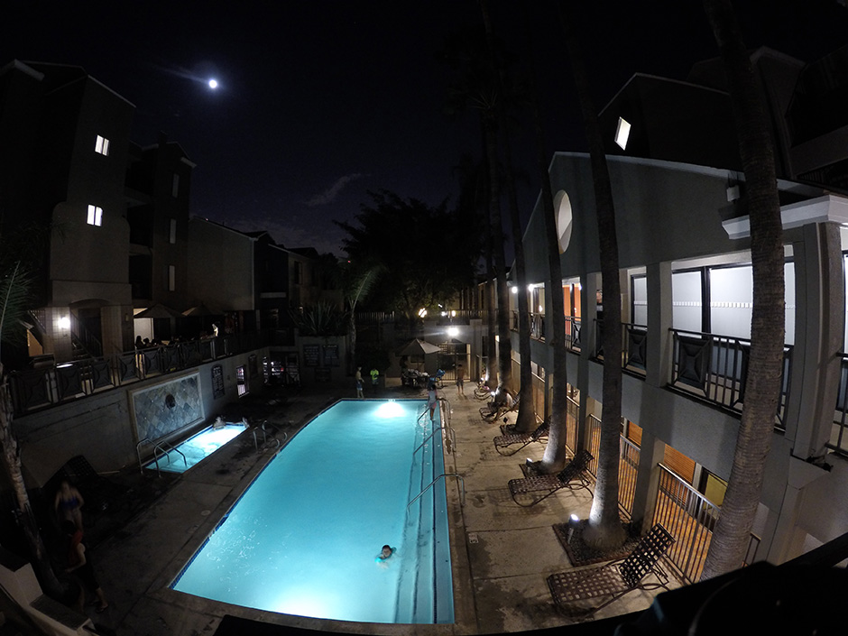 Na týchto nočných fotkách znova vidieť, že GoPro to umelo dosvetľuje. Nádherne to vidieť na zadnom osvetlení, či nedotiahnutie tieňov v ľavom rohu bazéna. Pritom svetlo bolo do žlta a mesiac bol biely, čo TomTom zachoval, ale GoPro zachoval náznak žltej iba v prízemnej chodbe. S tou žltou farbou je to vidieť aj na prvých fotkách s kvetmi.