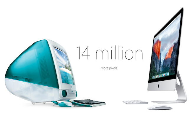 • Displej má o 14 miliónov viac pixelov. iMac G3 mal totiž displej s rozlíšením 1024×768 bodov, zatiaľ čo najnovší iMac má displej s rozlíšením 5120 x 2880 bodov.