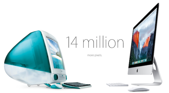 - Displej má o 14 miliónov viac pixelov. iMac G3 mal totiž displej s rozlíšením 1024×768 bodov, zatiaľ čo najnovší iMac má displej s rozlíšením 5120 x 2880 bodov.