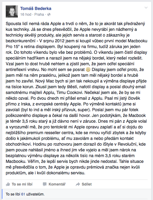 Obdivuhodný přístup Applu, ale možná by nebylo od věci popsat/zjistit, co vlastně T. Bederka v tom dlouhém @ Cookovi napsal. Asi to nebylo jenom „Poškodil jsem si vlastní vinou MacBook, který je po záruce, můžete mi ho prosím zdarma opravit?“