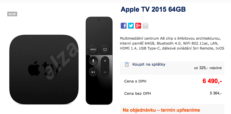 Dnes dopoledne jsme vás informovali, že server MacRumors informoval o evropských cenách nové Apple TV 4 a iPadu Pro. V článku jste mohli najít ceny v eurech ze sousedního Německa a odhadovaný přepočet na české koruny. To jsme ale ještě netušili, že český Apple Authorized Reseller Alza.cz také nabízí oba zmíněné produkty v České republice a dokonce i prozradila přesné ceny obou novinek, které dorazí na náš trh úplně stejně jako do na všechny ostatní.