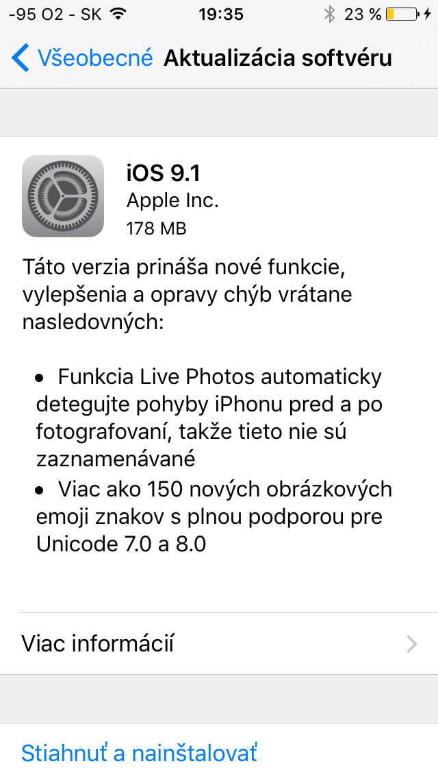 Napokon už len tri zásadné opravy. Bol tu vyriešený problém, pri ktorom sa v tele audiospráv zobrazil sivý pás, problém, ktorý u niektorých operátorov spôsoboval chyby počas aktivácie a napokon, bol opravený problém, ktorý bránil aktuaizácii niektorých aplikácií z App Storu. Aktualizácia iOS 9.1, ktorej veľkosť sa pohybuje na úrovni okolo 180-200MB, je dostupná pre všetky podporované zariadenia, čiže iPhone 4s, iPad 2 a všetky novšie.