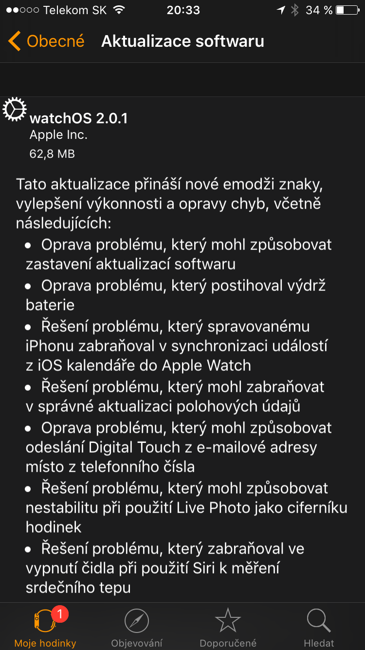 Aj keď celkom nečakane, tak spoločnosť Apple práve vydala novú aktualizáciu systému watchOS 2.0.1, ktorú si môžu majitelia hodiniek stiahnuť hneď teraz s pomocou aplikácie na svojom telefóne. Aktualizácia prináša opravy chýb, ktoré sa mohli objaviť v prvej verzii systému watchOS 2, ktorý predstavoval najväčšiu aktualizáciu systému od vydania hodiniek v prvej polovici tohto roku na vybraných trhoch. Ako som už spomenul vyššie, tak systémová aktualizácia prináša v prvom rade opravy chýb, ale tiež do nej bola zahrnutá podpora 150 nových smajlíkov Emoji zo sád Unicode 7 a Unicode 8, ktorí boli zahrnutí aj do updatu iOS 9.1, o ktorom sme informovali pred malou chvíľou. Podmienkou pre updatovanie systému je, aby ste mali na hodinkách aspoň 50% batérie a mali ich napojené na nabíjačke a v dosahu iPhonu. Podmienkou pre inštaláciu watchOS 2.0.1 je, aby mali užívatelia nainštalovaný iOS 9.1 na telefóne.