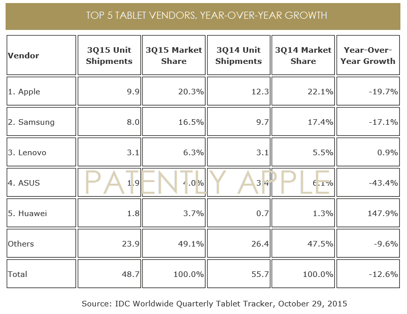 Je už obecně známo, že poptávka po tabletech za poslední rok výrazně klesla a poklesu se bude držet i v několika následujících měsících a možná i letech. Apple také během finančních výsledků oznámil, že prodeje iPadu poprvé v tomto roce klesly, což se ale dalo předpokládat, jelikož až na výjimky klesají prodeje všem výrobcům tabletů na trhu. Nicméně i přes klesající zájem o tablety je iPad stále tím nejprodávanějším vůbec a Apple má na tomto trhu pořád největší podíl ze všech společností.