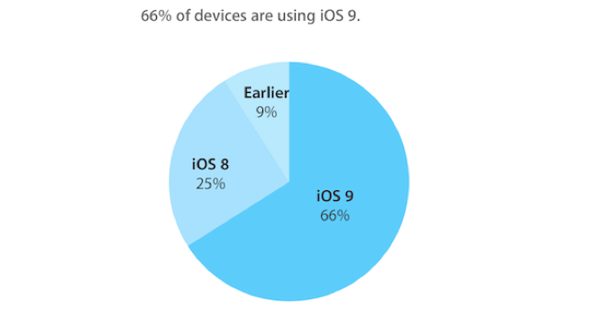 Apple včera aktualizoval statistiky na vývojářských stránkách, kde mimo jiné informuje o procentuálním zastoupení jednotlivých verzí systémů. Podle nejnovějších statistik je iOS 9 nainstalovaný již na 66% kompatibilních zařízeních, což je přibližně za dva měsíce poměrně slušný výsledek a Apple je za něj jedině rád. Jen pro příklad – před dvěma týdny byl iOS 9 nainstalovaný na 61% zařízeních.