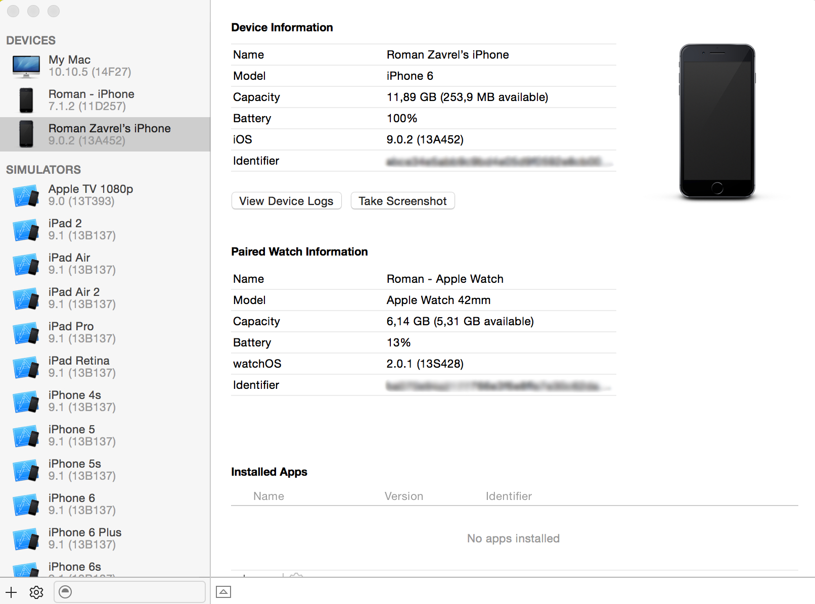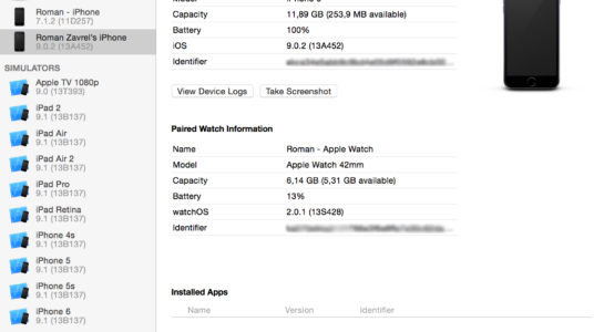 Jak zjistit UDID na svém iPhonu ví zřejmě každý, najdete jej přímo v iTunes po připojení iPhonu, ovšem hodinky Apple Watch s iTunes nesynchronizujete. Jediná šance jak zjistit v současné době UDID Apple Watch je stáhnout si zdarma dostupný Xcode. Následně musíte k počítači přes USB připojit iPhone, ke kterému máte spárované Apple Watch (vše musí být propojeno) a následně v Xcode stiskněte kombinaci Cmd + Shift + 2. Následně vyberte telefon ke kterému máte připojeny Apple Watch a uvidíte kromě informací o telefonu také informace o svých Apple Watch včetně jejich UDID.