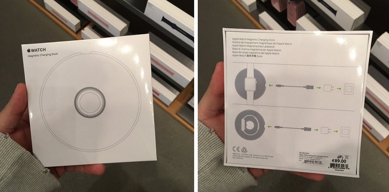 Fotografie docku ukazují, že hodinky budete moci do dokovací stanice umístit na dva způsoby. Buď klasicky pohým položením, nebo vysunete magnetický držák, který bude hodinky držet ve vzpřímené poloze. Díky tomu budete moci využívat hodinky i v jejich nočním režimu, kde zobrazují čas jako budík. K dokovací stanici dostanete dva metry dlouhý Lightning kabel, aby zapojení například na nočním stolku bylo co nejvíce pohodlné.