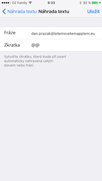 iOS se totiž už poměrně dlouhou dobu chlubí užitečnou funkcí klávesových zkratek, která byla v iOS 9 přejmenována na „Náhrada textu.“ Sem si totiž jednoduše přidáte zkratku, která za vás napíše dlouhou e-mailovou adresu, přitom vy jen zadáte kdekoli na iPhonu dva znaky za sebou.