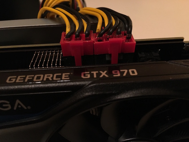 Do grafické karty zapojíme PCI-E kabely a na připájený kabel k PCB připojíme molex kabel ze zdroje.