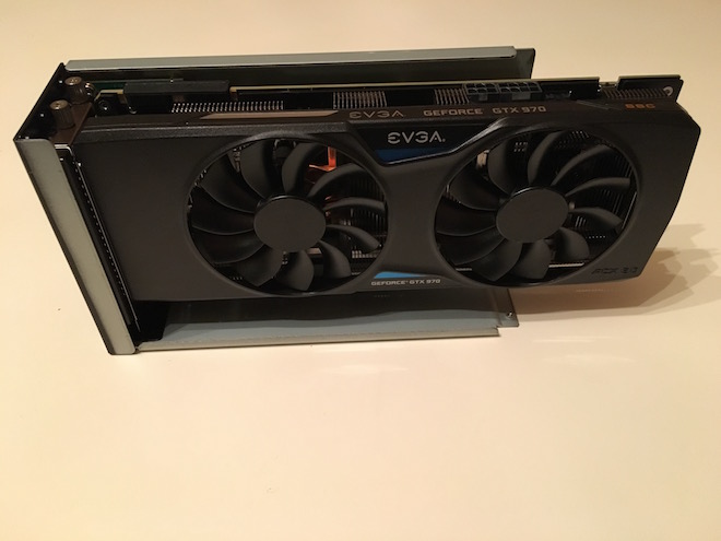 Zde je problém s tím že ne každá se vejde výškově tak aby se mohl použít originální box. Já si vybral nízkoprofilovou EVGA GTX 970 SSC, která je delší než box ale na výšku se vejde. Když se koupí třeba Zotac GTX 970 tak u té stačí demontovat kovový kryt ventilátorů a celá se do boxu schová.. Největší problém je převýšení nad hranu slotu.