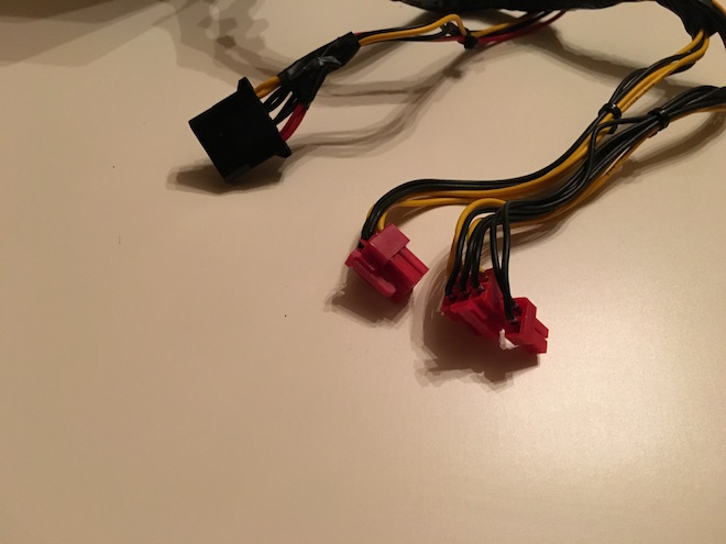 Nejprve je nutné nějak zdroj zapínat a proto jsem musel spojit zelený a černý kabel z 20/24 pinového konektoru a nechat je spojené (zdroj bude při napájení ihned spuštěn). Počítačový zdroj má mnoho konektorů, které jsou na externí GPU zbytečné. Proto je buď možné koupit plně modulární zdroj a nebo kabely zakrátit a zaizolovat. Jediné co nám musí zůstat je PCI-E 6PIN/8PIN jedna větev na které jsou molex konektory. Jako poslední věc je potřeba trochu zkrátit PCI-E konektory, jen jsem ořízl plast kolem kabelů proto, aby se vešli do boxu.