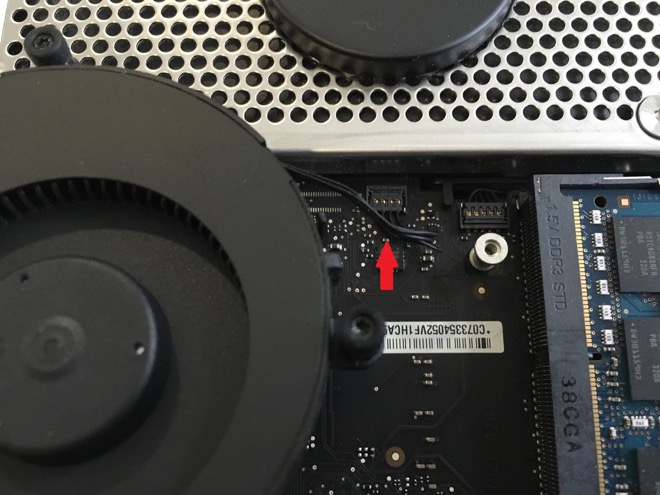 3. Po jejich demontáži odklopte ventilátor výdechem nahoru a odpojte kabel ze základní desky.
