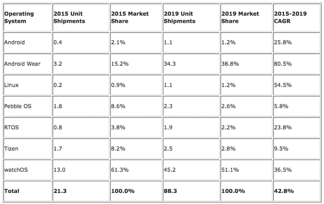 V roku 2019 bude mať Apple 51,1% podiel na trhu, zatiaľ čo Android Wear bude mať 38,8% a ostatné platformy, ako napríklad Tizen, budú dotvárať zvyšných 10,1%. Apple Watch by sa dokonca podľa IDC mali stať akýmsi meradlom pri porovnávaní s inými hodinkami a platformami, pretože majú podľa agentúry dve hlavné výhody – rýchlo rastúci počet aplikácií a lojálnu základňu užívateľov. Hlavným dôvodom pre rast platformy Android Wear je fakt, že sa o túto platformu opierajú jednak technologické spoločnosti ako Huawei a jednak tradiční hodinári ako napríklad TAG Heuer. Rast popularity môže čakať aj Pebble kvôli svojmu jednoduchému prostrediu, nízkej cene a za našu redakciu by som doplnil aj dlhú výdrž batérie.