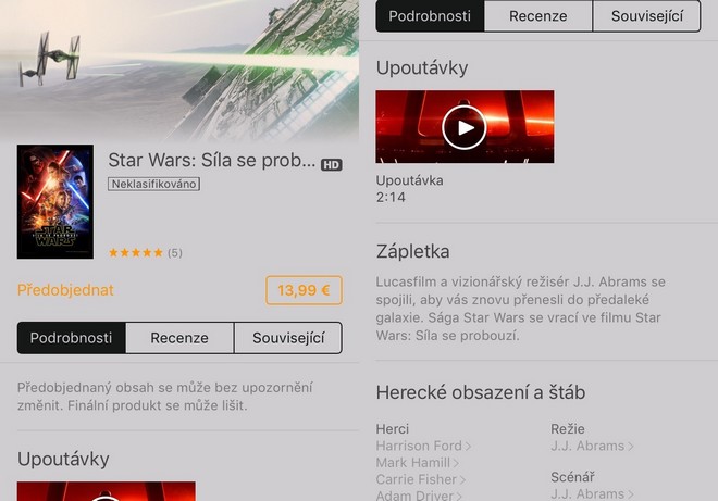 Minulý týden se do kin dostal další díl populární série Star Wars s názvem „Síla se probouzí“. Někteří z nás již film viděli a někteří ne, pokud již však nyní víte, že si film budete chtít na iTunes zakoupit, můžete si jej předobjednat. Stránka, která je filmu vyhrazena, je zatím docela holá. Je zde pouze pár informací o zápletce filmu, dvouminutová upoutávka, herecké obsazení a štáb. Naleznete zde také oznámení, že předobjednaný obsah se může bez upozornění změnit.