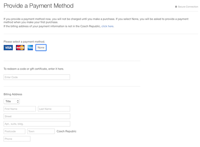 - Jakmile se dostanete do záložky vyžadující zvolení platební metody, vyberte položku NONE.