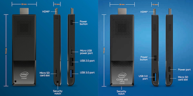 Najlacnejšia verzia Compute Stick disponuje štvorjadrovým procesorom Intel Atom v kombinácii s 2GB RAM a 32GB vstavaným úložiskom, na ktorom je už predinštalovaný Windows 10. Na základnú prácu to teda vystačí. Táto verzia sa dostane do predaja už čoskoro a neskôr vo februári/únoru vyjdú verzie s čipmi Intel Core m3 a Intel Core m5, ktoré ešte k tomu ponúknu podporu Bluetooth 4.2, nebudú mať port USB 2.0, ale zato budú mať 4GB RAM a 64GB úložiska, takže v podstate ponúknu rovnaký výkon ako 12″ MacBook. Všetky tri modely potom majú podporu 802.11ac WiFi, čo poteší.