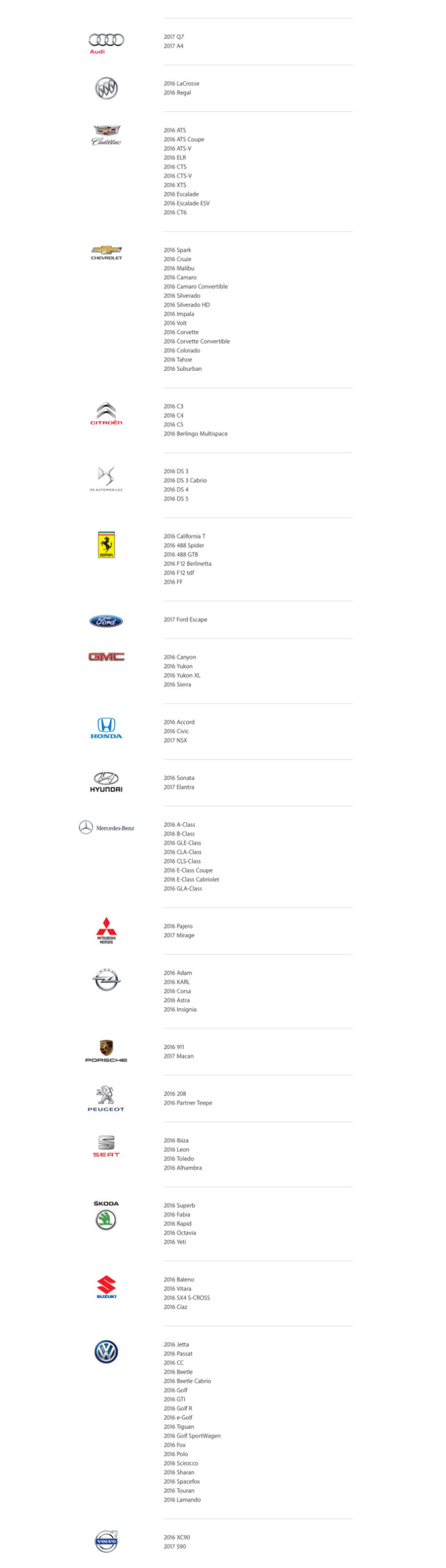 Kompletní seznam najdete přímo na těchto stránkách nebo si jej můžete prohlédnout na snímku níže, který pro detailnější zobrazení rozklikněte. Konkrétně zahrnuje 104 vozů od 21 automobilek.