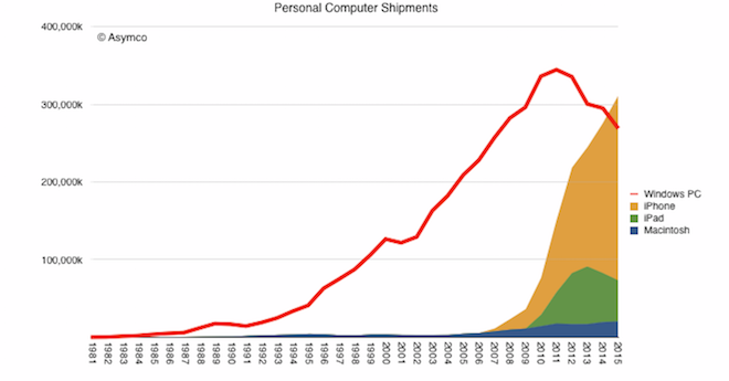 Budúcnosť je v mobilných zariadeniach a že ide o neodvrátiteľný trend, tomu nasvedčujú aj ich neustále rastúce predaje. V minulom roku dokonca len iOS zariadenia dokázali v predajoch prekonať počítače so systémom Windows, čím sa Applu podarilo prekonať významný míľnik. Apple mal podľa spoločnosti Asymco predať dokopy 300 miliónov zariadení, z čoho len približne 10 miliónov boli Macy, zato ďalších 290 miliónov boli iPhony a iPady (a iPodov touch), čo je o 15 miliónov viac, než koľko bolo predaných počítačov s Windows. Výrobcovia PC sa mohli pochváliť „len“ 275 miliónmi predanými kusmi. Po boku Asymca vydal aj Apple celkom zaujímavú štatistiku. A to že iOS 9, najnovšia verzia systému pre iPhone a iPad, je nainštalovaná na 75% všetkých aktívnych zariadení, ktoré sa pripájajú k App Store.