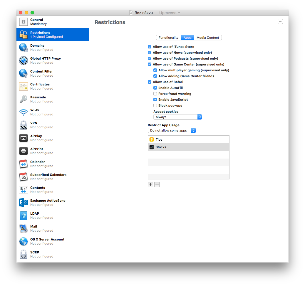 Abyste aplikace odstranili, musíte v nástroji vytvořit konfigurační profil a v sekci Restrictions kliknout na položku Apps a zde dole zvolit Do not allow some apps. Do seznamu pak musíte přidat ID aplikací jako com.apple.tips nebo com.apple.stocks (více naleznete níže nebo zde). Pak už jen stačí připojit své zařízení k Macu a aplikovat profil tak, že kliknete na zařízení pravým tlačítkem a dáte Add –> Profiles a vyberete ten, co jste si uložili například do dokumentů. Po aplikování profilu ikony zvolených aplikací zmizí z domovské stránky. Aby aplikace zmizeli, musí být vaše zařízení ve stavu „Supervised.“