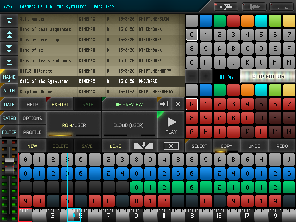 A přesně v momentě, kdy zkrotíme sílu stepsequenceru, syntetizéru a trackeru, objeví se další rozměr – Rytmik Cloud. Dal by se nazvat úvodem do sociálního komponování, protože se prozatím jedná o poměrně unikátní a neprozkoumanou oblast. Každou vlastní skladbu můžeme ihned sdílet s ostatními uživateli Rytmiku a to buď k poslechu, nebo i k editaci. Naopak od ostatních tvůrců se tak můžeme nejen inspirovat, ale použít jejich zvukové paterny nebo remixovat celé skladby. A pokud se nám nějaká skladba líbí, můžeme hvězdičkovat. Na Rytmik Cloud je potom možné skladby filtrovat podle žánrů a řadit je třeba právě podle hodnocení. Pokud si k poslechu zapneme dynamickou vizualizaci, tak už nezbývá než si popřát ostrý obraz a čistý zvuk.