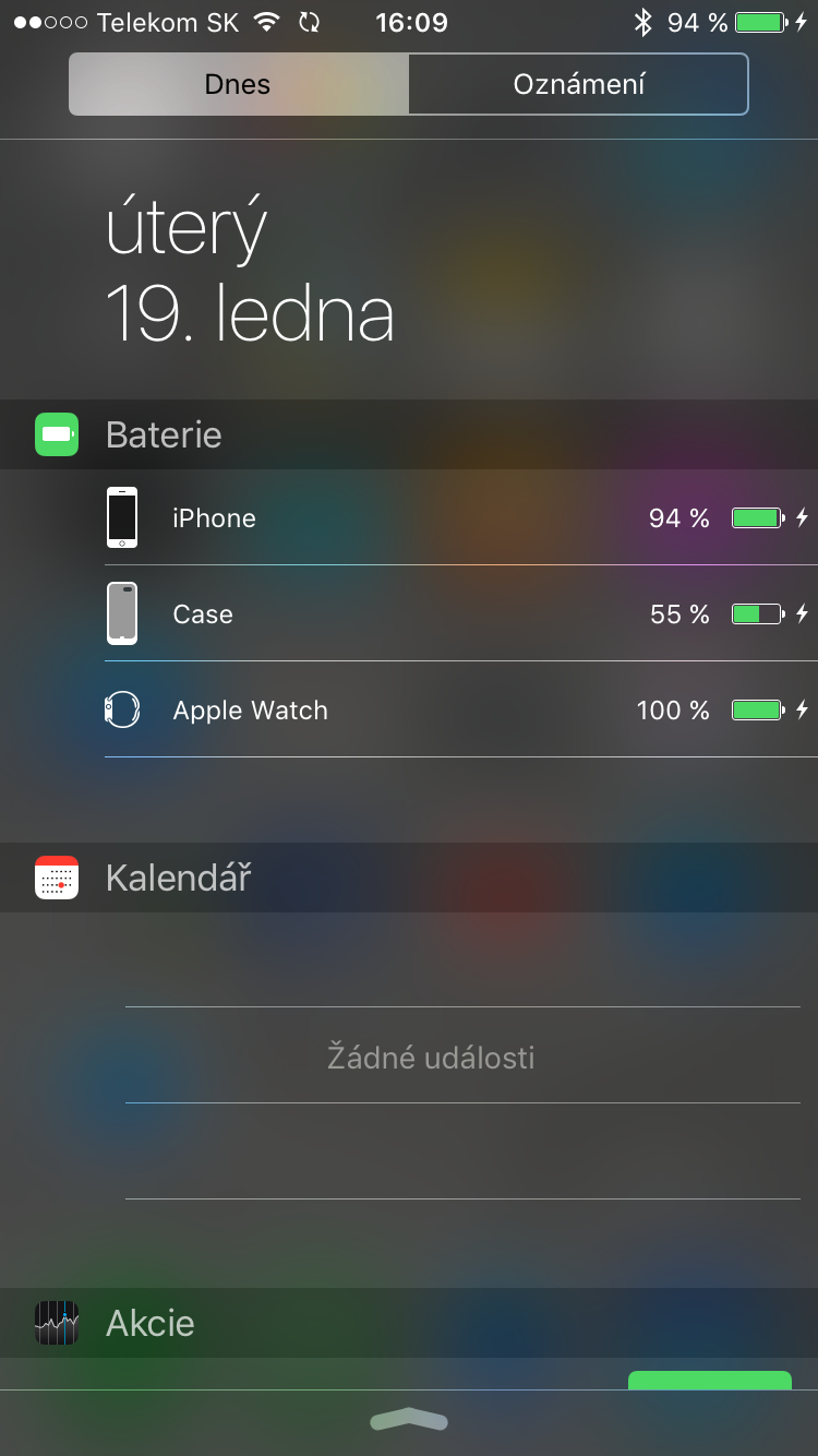 Informace o stavu baterie v iPhonu a v obalu vidíte v oznamovacím centru, kde mimo jiné máte přehled také o stavu baterie Apple Watch. Samozřejmě stav baterie samotného iPhonu je nadále vidět také v pravém horním rohu telefonu a dokud bude mít Apple Battery Case alespoň procento energie, uvidíte vedle této informace také blesk, který značí, že se váš telefon z obalu dobíjí. Je škoda, že Apple nedovolil zapnout přímo do horní lišty také informaci o stavu baterie v samotném obalu, ale co už naděláme. Bohužel během nabíjení samotného obalu a telefonu pomocí lightning kabelu musíte pro zjištění stavu nabití Apple Battery Case otevřít oznamovací centrum.